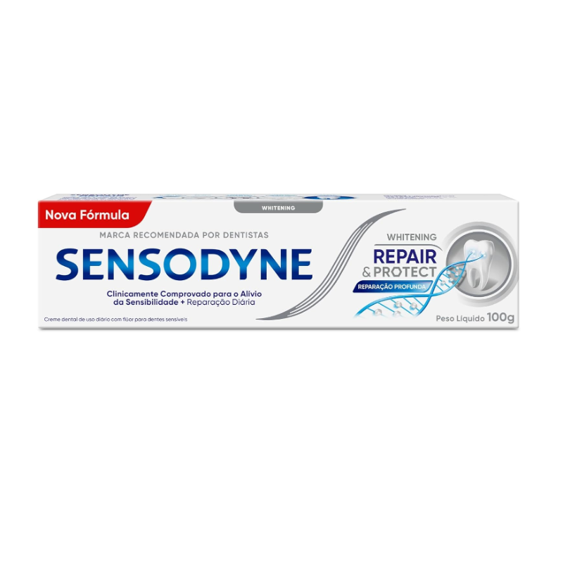 Sensodyne Repara e Protege é um creme dental clinicamente comprovado que oferece alívio para a sensibilidade dos dentes, proporcionando proteção diária, reparação contínua e agindo para restaurar o branco natural. Com a melhor tecnologia disponível no mercado para dentes sensíveis, essa pasta de dente também contém flúor, um elemento essencial no fortalecimento do esmalte dentário e prevenção de cáries. Ao usar a pasta de dente Sensodyne, você estará protegendo seus dentes sensíveis contra sensibilidades causadas por alimentos quentes ou frios, além de desfrutar de uma proteção e reparação diária para sua saúde dental. Recomenda-se escovar os dentes duas vezes ao dia, diariamente, para aproveitar ao máximo os benefícios desse produto.