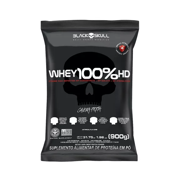 "Whey 100% HD é mais um mega suplemento da linha caveira preta! Composto por três tipos de whey protein (concentrado, isolado e hidrolisado), ele é uma ótima opção para auxiliar no ganho de massa muscular! Além disso, sua composição conta também com a adição de BCAA, aminoácidos de cadeia ramificada que contribuem para uma melhor recuperação pós-treino.