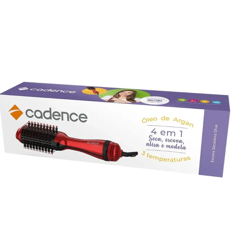 Perfeito controle de secagem e modelagem, com 3 níveis de temperatura e 1200W de potência, 4X1 - seca, alisa, modela e escova! com revestimento cerâmico com óleo de Argan, que ajudam a proteger e hidratar os fios. Você terá o poder do secador aliado à praticidade da escova em um único produto. Características Ela seca e escova, ou seja, tem a versatilidade e o dinamismo que alguém como você tanto precisa. Ideal para quem procura praticidade, fácil manuseio, além de cabelos secos, lisos e macios. Design Cadence A evolução da escova para o dia a dia mais simples. Simples de usar Super leve e fácil de manusear com cabo giratório 360°.