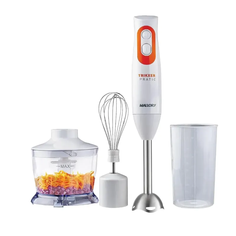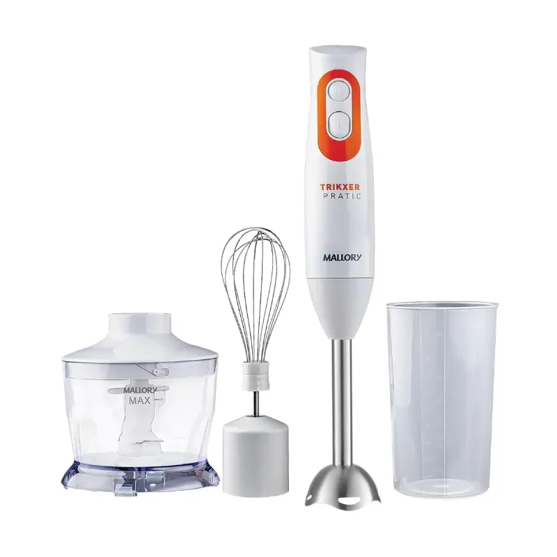 O TRIKXER PRATIC da Mallory é 3 em 1, tem alta performance, funciona com apenas um clique e duas velocidades: função pulsar ou turbo. Versátil, é mixer, processador e batedor de massas leves, trocando apenas o acessório. Prático e superpotente, possui lâminas em aço inoxidável que picam gelo, Mix Up System que melhora a circulação dos alimentos pelas lâminas e braço em aço inox que possibilita o preparo de alimentos quentes. Desmontável e de fácil limpeza. Acompanha um copo ultra resistente. Tenha mais opções e varie o cardápio ao preparar sucos, vitaminas, shakes, smoothies, molhos e outras diversas receitas.