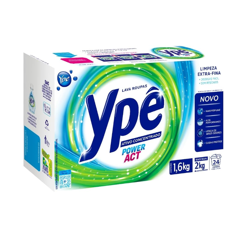O Lava Roupas Ypê Power Act 1,6kg possui fórmula exclusiva com a mais alta concentração de ativos de limpeza do mercado, sendo o único com Oxigênio Ativo, o mesmo ingrediente dos Tira-Manchas. A versão 1,6kg rende 24 lavagens.