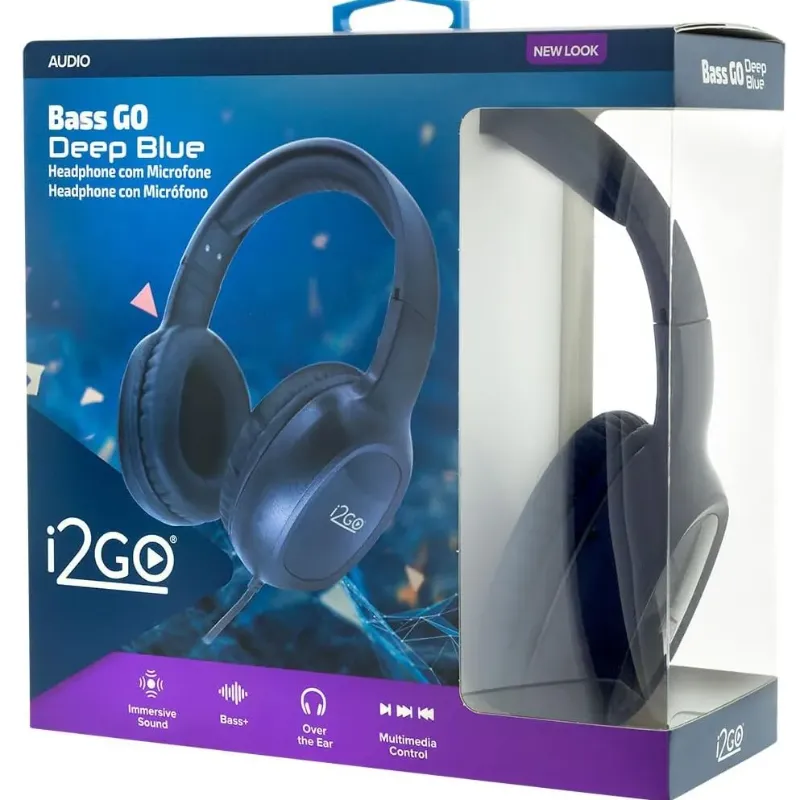 O Headphone Bass GO Deep Blue i2GO te proporciona um som em alta definição e com graves profundos para você curtir as suas músicas, vídeos, jogos no Smartphone ou notebook, podcasts e muito mais! Ele é o headphone perfeito para fazer as suas reuniões online, videochamadas e atender ligações. Aproveite uma experiência sonora intensa com a tecnologia Bass+, que proporciona graves poderosos, dinâmicos e um som nítido. Este super Headphone foi desenvolvido com um material leve e resistente, além de almofadas acolchoadas para total conforto. Seu cabo de 1,2m é do estilo flat, que não embaraça e possui um botão Mic Control Multimídia. Especificações Técnicas Driver: 40mm Frequência: 20 - 20.000Hz Sensibilidade: 102dB ±3dB Impedância: 32? Conector: 3,5mm Comprimento do Cabo: 1,2m Itens Inclusos 1 Headphone com microfone Compatível com: dispositivos Android, iOS, Windows e outros com conector 3,5mm.