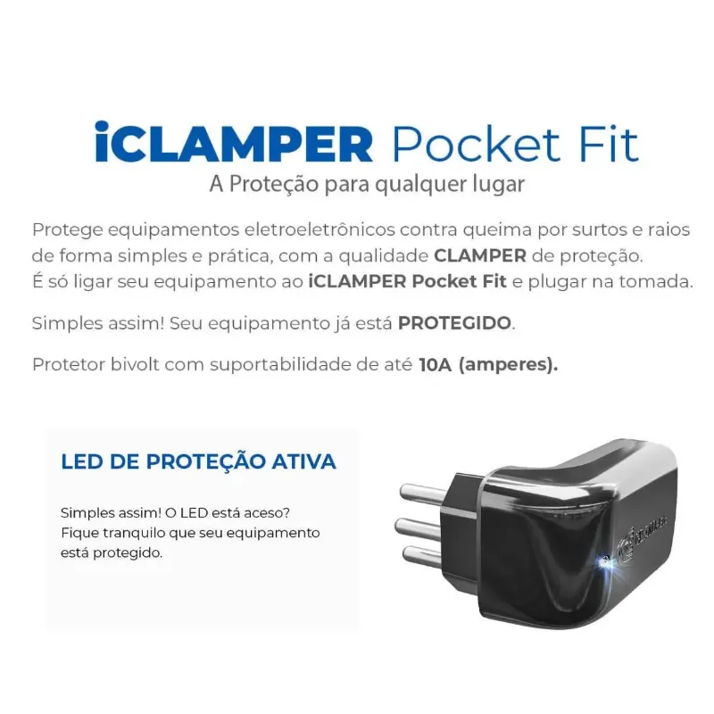 iCLAMPER Pocket Fit 3P é um DPS portátil, ideal para proteção de eletroeletrônicos móveis, como smartphones, laptops e tablets; e também equipamentos individuais de ambientes residenciais, corporativos e industriais conectados à rede elétrica.