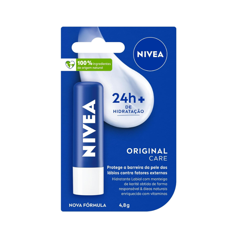 O que é? NIVEA Hidratante Labial Original Care é essencial para manter os lábios macios e protegidos por 24 horas Para que serve? Sua fórmula com óleos naturais proporciona hidratação intensa, defendendo contra condições adversas como frio, vento e clima seco. Este hidratante labial é enriquecido com manteiga de karité e garante uma aplicação uniforme sem necessidade de espelho. Além de cuidar dos lábios, também é amigo do meio ambiente, com embalagem reciclável. Livre de óleos minerais, é uma escolha saudável para os seus lábios. Mantenha-os sempre radiantes e confortáveis com NIVEA Hidratante Labial Original Care. Um aliado diário para lábios irresistíveis.