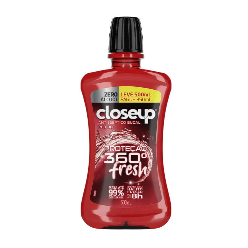 "• Mata até 99% dos germes que causam placa, gengivite e mau hálito. • Previne a placa e as cáries • Sinta seu hálito fresco por até 8h • Alcança onde a escova e o fio dental não chegam, e age em bactérias que causam problemas bucais. • Refrescância completa com cuidado bucal completo • Nessa embalagem leve 500ml e pague 350ml Conheça o novo Antisséptico bucal Closeup Proteção 360º Fresh. Graças à sua fórmula exclusiva, mata até 99% dos germes e bactérias que causam placa, gengivite e mau hálito, prevenindo a placa e as cáries. Alcança onde a escova e o fio dental não chegam, agindo em bactérias que causam problemas bucais. Sinta seu hálito fresco por até 8h com o uso de Closeup Proteção 360º Fresh. Porque uma refrescância completa começa com um cuidado bucal completo para você ter toda confiança que precisa para chegar mais perto! O sabor Red Hot apresenta notas picantes de cravo combinadas com notas de menta específicas, proporcionando uma sensação de frescor. Modo de usar: após a escovação e uso de fio dental, pela manhã e à noite, faça bochechos com 20ml de Closeup Proteção 360º Fresh durante 30 segundos. Não diluir. Não ingerir o produto. Nesta versão econômica, leve 500ml e pague 350ml. Experimente também as outras versões dos Antissépticos Closeup 360º fresh: Ice sem álcool 500ml eIce com álcool 500ml. Use diariamente a linha completa de Closeup géis, cremes dentais, escovas de dentes e antissépticos bucais para ter um cuidado bucal completo, além de garantir proteção contra as cáries e o mau hálito."