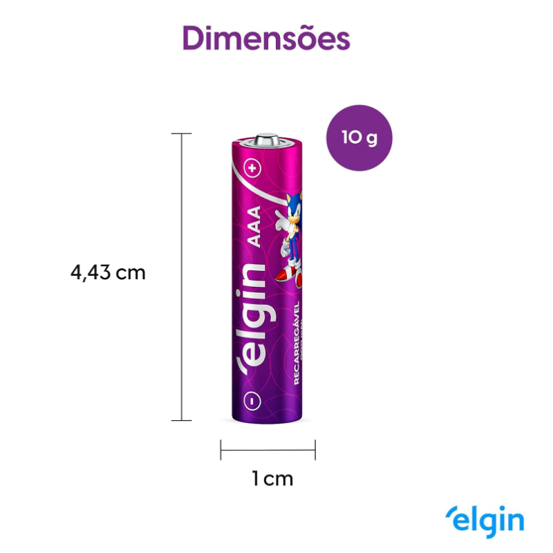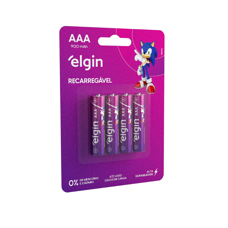 As pilhas recarregáveis Elgin têm parceria com a Sonic the Hedgehog e foram desenvolvidas nos mais altos padrões de qualidade para garantir o funcionamento dos dispositivos por mais tempo com mais estabilidade. Elas permitem até 1000 recargas, tornando um produto além de econômico, muito sustentável. Entre 11 marcas de pilhas do mercado avaliadas em testes do INMETRO, as pilhas Elgin apresentaram um resultado excelente na relação custo por hora útil. Além disso, elas são testadas periodicamente por laboratórios credenciados pelo INMETRO, para garantir a qualidade e conformidade com a resolução Conama 401.