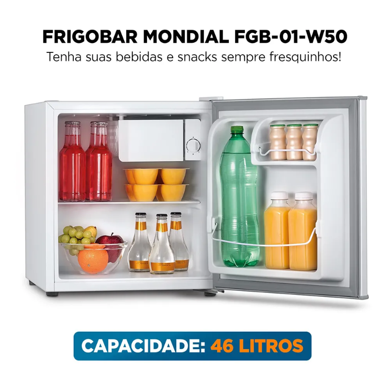 O Frigobar Mondial 46L FGB-01-W50 é uma ótima solução para quem deseja manter snacks, bebidas e frutas sempre fresquinhos em salas de TV, quartos ou varandas. Sua porta reversível, ajustável para abrir à direita ou à esquerda, possibilita que o frigobar se encaixe em diferentes espaços.