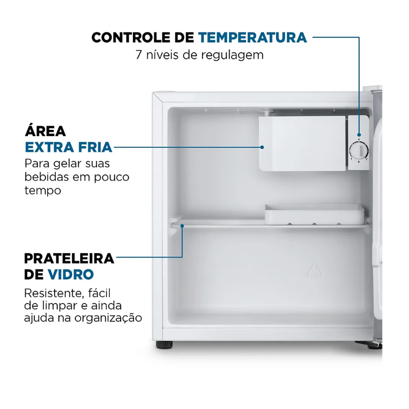 Com design compacto, o interior foi projetado para aproveitar cada centímetro de forma eficiente. A prateleira de vidro temperado, além de oferecer estabilidade e ser fácil de limpar, é ideal para organizar muito bem todos os itens. O compartimento interno da porta acomoda garrafas de até 2 litros, enquanto a área extra fria gela bebidas rapidamente, trazendo mais praticidade ao seu dia a dia.