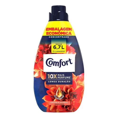 O Amaciante Concentrado Comfort Energia Floral tem 10x mais perfume** de longa duração, por isso deixa suas roupas perfumadas por muito mais tempo. Sua formulação incrível possui cápsulas de perfume que são liberadas durante a lavagem para deixar uma fragrância duradoura nas suas roupas e blindar o tecido contra o mau odor****. O amaciante de roupa Comfort concentrado possui perfume encapsulado que penetra no tecido durante o processo de lavagem, deixando sua roupa muito mais cheirosa até mesmo depois de seca! O motivo? Quando você se movimenta, essas cápsulas de perfume para roupas se rompem e liberam essa fragrância incrível, fazendo com que aquele cheirinho de roupa lavada dure muito mais! Além disso, sua fórmula contém óleo de argan*****, um óleo natural com alto potencial nutritivo, que perfuma e trata suas roupas, prevenindo os danos da lavagem, mantendo as cores*** do tecido vibrantes por mais tempo, evitando a formação de bolinhas*** e esgarçamento***. Comfort te oferece tudo isso com um ótimo rendimento, por ser concentrado, menos de meia tampinha basta* rende muito! Além de cuidar e perfumar suas roupas, o amaciante concentrado Comfort cuida do meio ambiente, sua garrafa e tampa são feitas com plástico 100% reciclado e reciclável. O Amaciante Concentrado Energia Floral cuida das suas roupas, pois possui ingredientes capazes de alinhar e proteger o tecido, reduzindo o atrito entre as fibras durante o processo de lavagem, evitando futuros danos nas peças. *Considerando recomendação de dosagem para máquinas até 8 kg (20 ml). **Teste analítico com 22,5 ml de produto comparado com marca diluída, sem perfume encapsulado do mesmo fabricante. ***Benefícios de tratamento do amaciante obtidos versus roupas lavadas sem amaciante. ****Baseado em testes realizados com odores representativos. *****Com óleo de argan na composição da fragrância.
