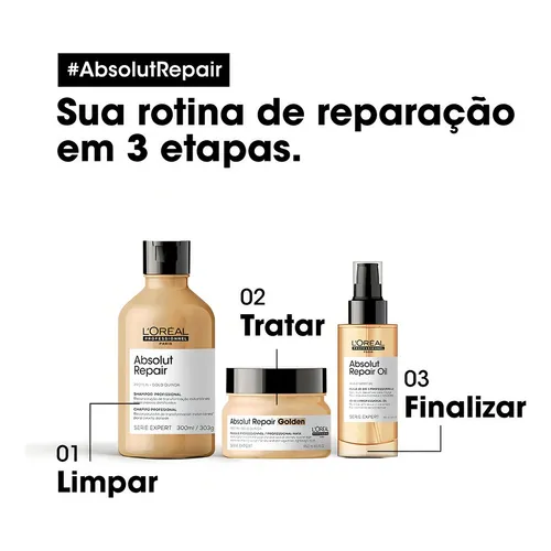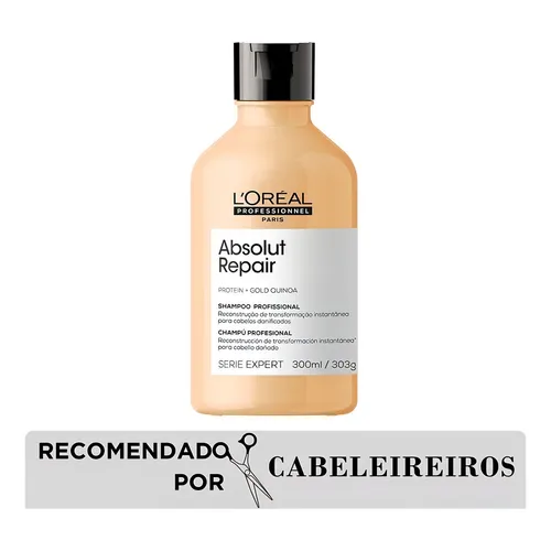O Shampoo Absolut Repair Gold Quinoa + Protein L'Oréal Professionnel traz ativos que ajudam restaurar a superfície dos fios para que o cabelo revele uma aparência mais saudável. Com shampoo Absolut Repair seu visual ganha muito mais brilho e um toque macio incrível.