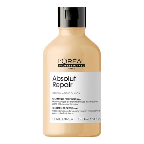 Shampoo para cabelos danificados. L'Oréal Professionnel Serie Expert Absolut Repair Gold Quinoa + Protein reestrutura a fibra capilar, confere brilho e leveza durante a limpeza diária dos fios.