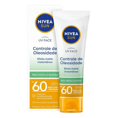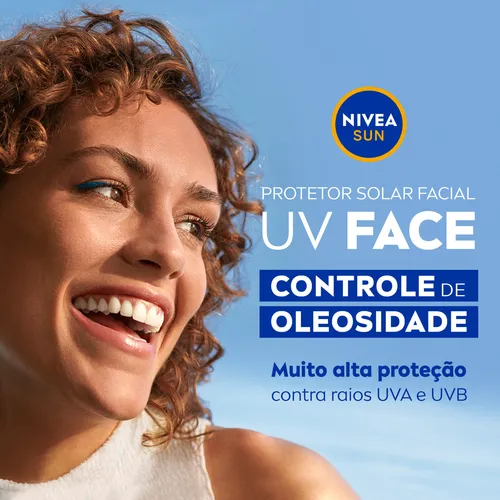 NIVEA Sun UV Face Controle de Oleosidade FPS 60 é um protetor solar com alta proteção que, além de não obstruir os poros, controla a oleosidade da pele, mantendo a aparência sequinha ao longo do dia. Oferece textura leve e não pegajosa, sendo ideal para uso diário. Fórmula oftalmologicamente testada.