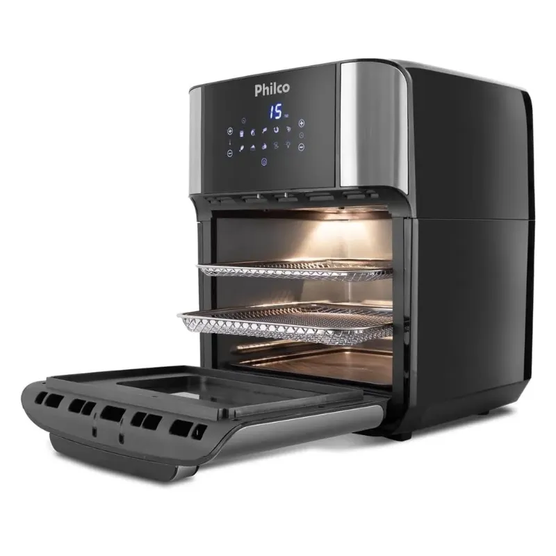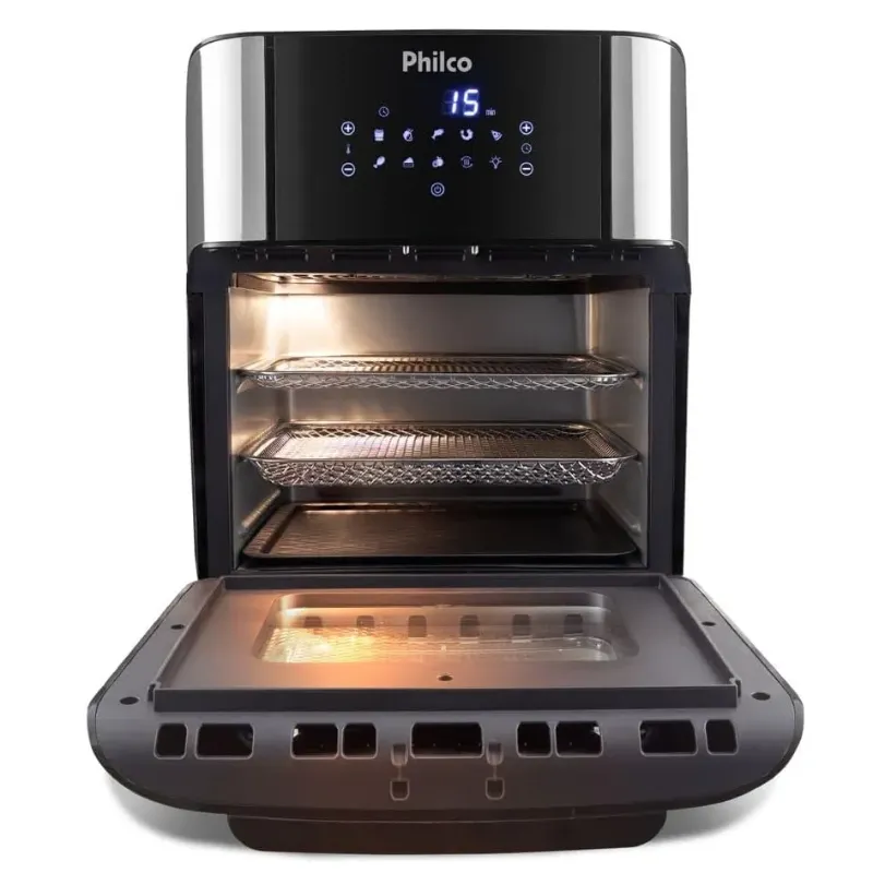 Tecnologia e praticidade em perfeito equilíbrioToda a agilidade e vantagens da tecnologia Air Fry aliadas à versatilidade do forno elétrico. A Fritadeira Air Fry Oven PFR2000P vai mudar completamente sua maneira de cozinhar. Ela frita sem óleo, assa com perfeição e abre infinitas possibilidades na cozinha! 2 em 1: A PFR2000P tem 1700W de potência e você pode utilizar como Air Fry ou Forno. A função Air Fry faz com que o ar quente envolva envolva os alimentos por completo, garantindo o cozimento perfeito e uma casquinha crocante por fora. O forno é indispensável na cozinha e abre infinitas possibilidades para suas receitas. Seus 11 litros de capacidade total, a tornam uma verdadeira gigante da sua categoria. Você tem espaço de sobra para preparar todos os tipos de delícias. Possui controle de temperatura de 80oC a 200oC e timer de até 60 minutos com alarme sonoro e desligamento automático. Acompanha 3 assadeiras de diferentes alturas e um coletor de gordura. Temporta é removível para facilitar a limpeza e os preparos e conta com uma lâmpada interna, ativada por um painel touch. Para sua segurança, é equipada com proteção contra superaquecimento.