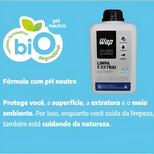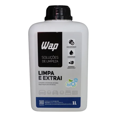 O WAP LIMPA E EXTRAI é um Limpador Concentrado de Baixa Espumação, indicado para o uso em Extratoras WAP e outros modelos de extratoras do mercado para a limpeza de sofás, cadeiras, poltronas, estofados automotivos, colchões, tapetes e carpetes. Sua fórmula com pH neutro, protege você, a superfície, a extratora e o meio ambiente. É altamente eficiente na remoção das sujeiras, renovando e perfumando o ambiente com uma sofisticada fragrância de cereja e avelã. É indicado para limpezas residenciais e profissionais. O uso deste produto somado às potentes Extratoras WAP proporciona um incrível resultado de limpeza, além de render mais, graças à sua fórmula concentrada que deve ser diluída em água.