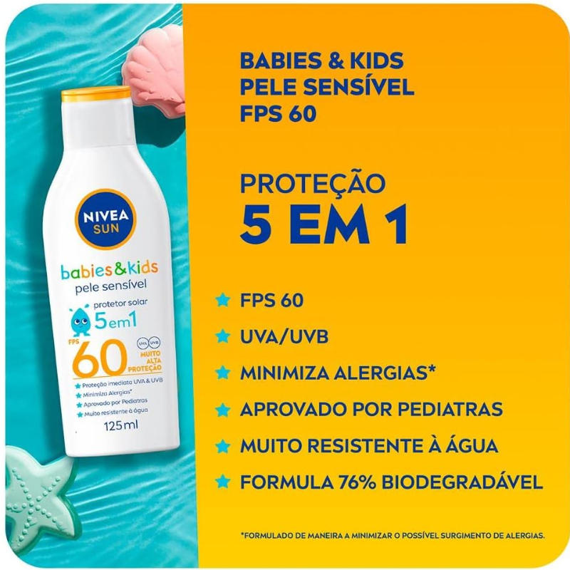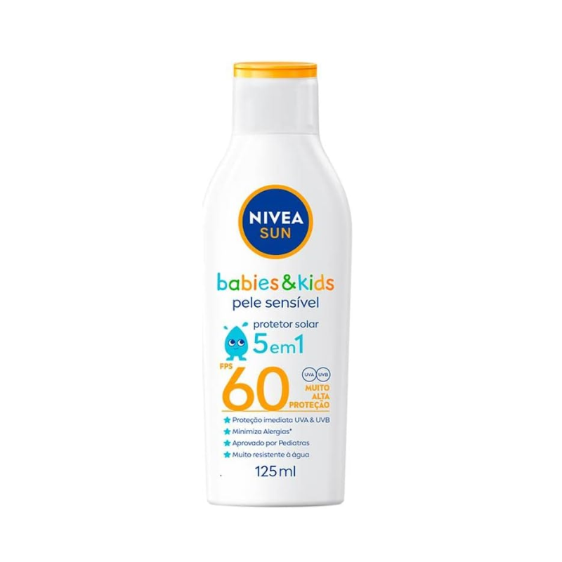 O que é? NIVEA SUN Protetor Solar Kids & Babies Pele Sensível FPS 60 é um protetor solar especialmente desenvolvido para crianças e bebês a partir de 6 meses. Para que serve? Este protetor solar de alta proteção, com FPS 60, desempenha um papel vital na preservação da pele sensível dos pequenos contra os danos nocivos causados pelo sol. Sua fórmula é cuidadosamente desenvolvida para minimizar alergias, sendo biodegradável e isenta de perfume, corantes e conservantes. Além de oferecer uma ampla proteção UVA/UVB, o NIVEA SUN Protetor Solar Babies & Kids Pele Sensível FPS 60 é altamente resistente à água, o que é essencial para as brincadeiras ao ar livre das crianças. O fato de ser aprovado por pediatras atesta a sua segurança para a pele sensível dos pequenos.