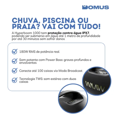 Caixa de Som Bluetooth WAAW Hyperboom 1000 180W RMS | IPX7 | Modo Broadcast | Até 12h de bateria
