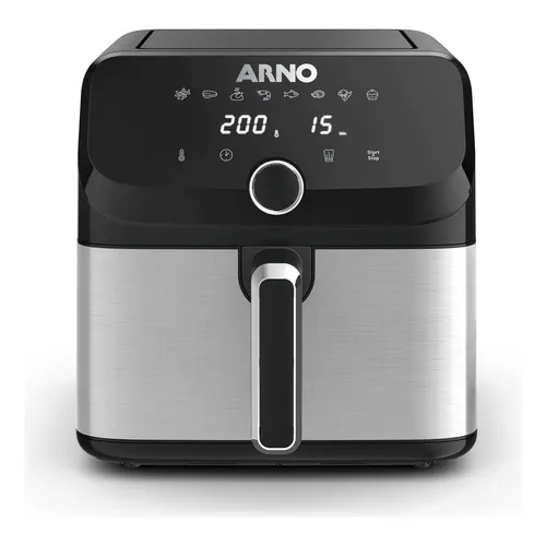 A Fritadeira Sem Óleo Arno Air Fry Mega Digital possui capacidade de 7,5L, adequada para preparar alimentos para até 8 pessoas simultaneamente. Com a tecnologia Hot Air, os alimentos ficam mais crocantes e saudáveis. Inclui um temporizador de até 60 minutos com desligamento automático. O revestimento antiaderente facilita a limpeza, tornando-a prática para o uso diário. Seu painel digital apresenta 8 funções predefinidas para cozinhar batatas fritas, bife, frango, camarão, peixe, pizza, legumes e sobremesas. Permite também o ajuste manual da temperatura até 200°C. Dispensa o uso de óleo no preparo dos alimentos, sendo uma escolha acertada para quem busca uma alimentação mais saudável.