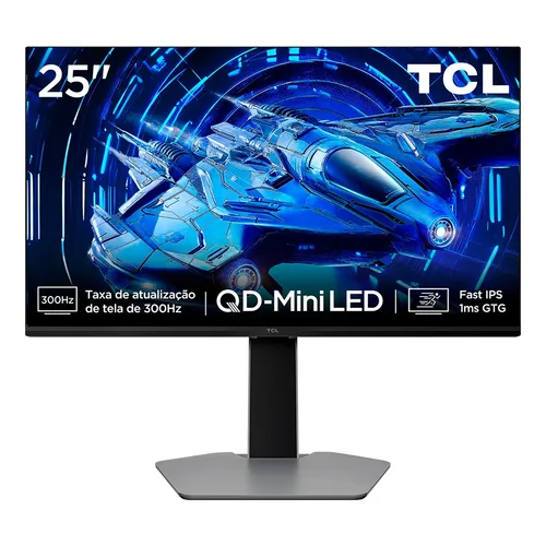 O Monitor TCL 25G64 combina qualidade de imagem com alto desempenho: tela QD Mini LED de 25", resolução Full HD e HDR600. Com taxa de atualização de 300 Hz e 1ms de resposta, é ideal para jogos rápidos e imagens fluidas. Possui conexões HDMI, DisplayPort e design moderno na cor preta.