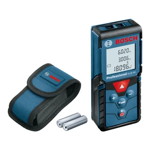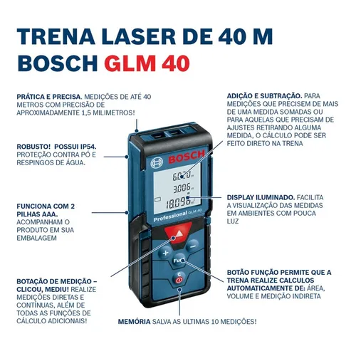 A Trena Laser Bosch GLM 40 é um medidor de distância a laser com alcance de até 40 metros que já realiza funções de calculo: com ele você pode calcular áreas, volumes e até alturas, para medir distâncias você só precisa apontar o laser para o local que deseja medir e pressionar o botão ele também permite realizar medições contínuas: veja o resultado aparecendo na tela em tempo real conforme move a trena, medição de área: meça a largura e o comprimento e o aparelho calcula na hora quantos metros quadrados tem o local, medição de volume: meça a largura, o comprimento, a altura e a trena calcula na hora, quantos metros cúbicos tem o ambiente, medição de altura indireta: calcule facilmente a altura até mesmo de locais que não têm um teto como anteparo.