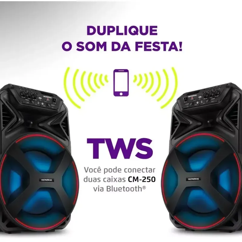 Vem equipada com a função TWS, uma tecnologia que permite conectar 02 caixas de som CM 250 sem fios, proporcionando uma potência de 250 watts de som em dois locais da sua festa sem a necessidade de cabos.