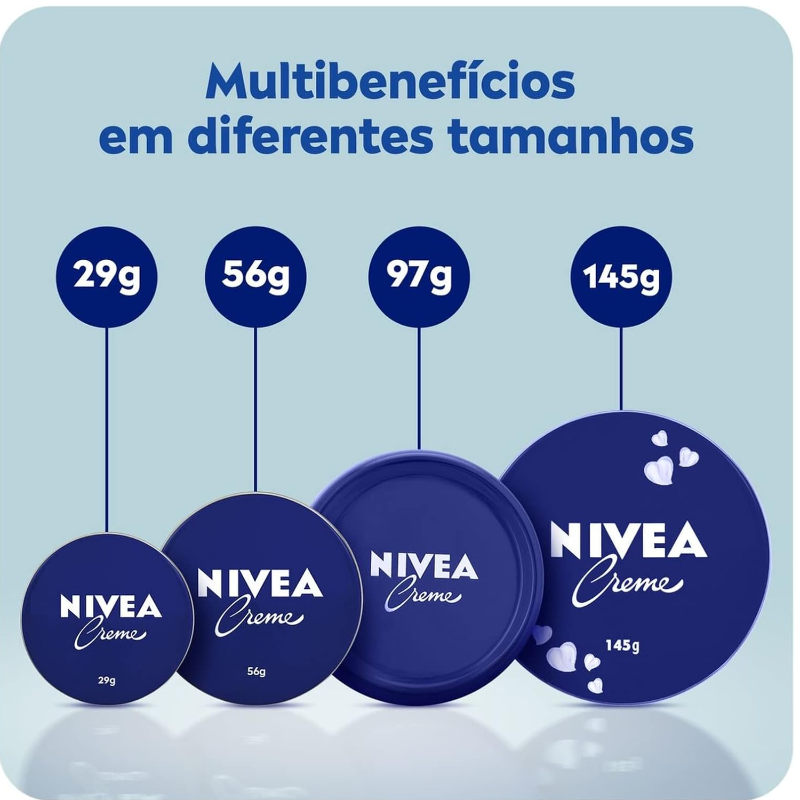 O que é? O NIVEA Creme Hidratante Lata é um creme clássico que proporciona hidratação profunda por até 24 horas. Reconhecido mundialmente, ele se destaca por seu cuidado completo e versátil contra a pele ressecada. Para que serve? NIVEA Creme Hidratante Lata cuida da pele, proporcionando uma hidratação intensa e prolongada. É ideal para o cuidado do rosto, mãos e corpo, especialmente em áreas que precisam de uma atenção extra contra o ressecamento. Por ser dermatologicamente testado, é seguro para uso diário, ajudando a manter a pele macia e hidratada. Benefícios e diferenciais: - Hidratação intensa por 24 horas - Cuidado completo para rosto, mãos e corpo - Dermatologicamente testado - O clássico de NIVEA - Uso versátil - Contra o ressecamento - 80% alumínio reciclado na lata* *Média do conteúdo reciclado anual - material pré e pós-consumo