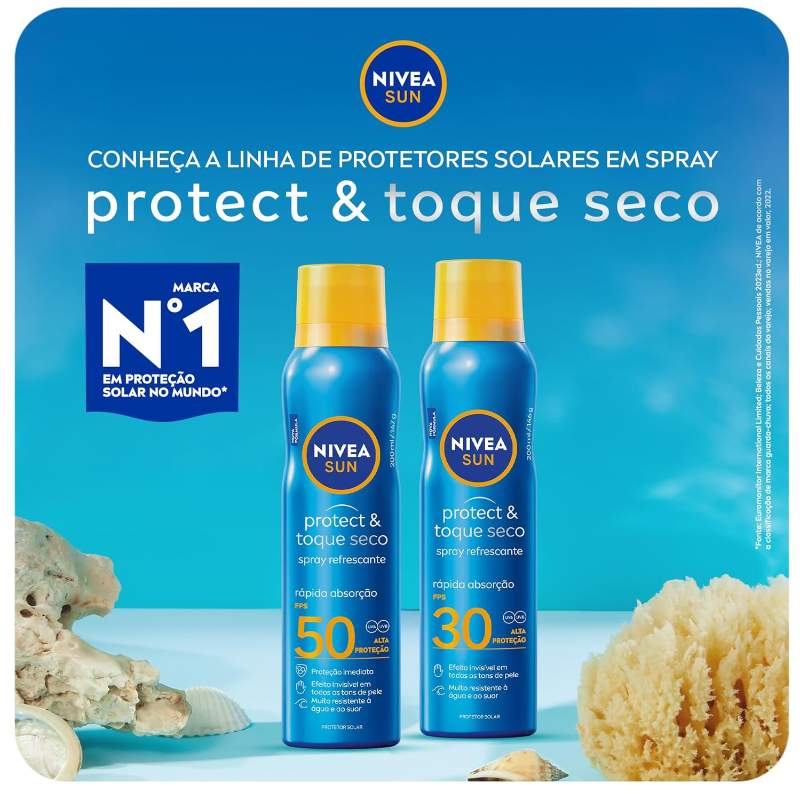 O que é? NIVEA SUN Protetor Solar Spray Protect & Toque Seco FPS 50 é um produto desenvolvido para oferecer muito alta proteção solar, praticidade e uma sensação refrescante na pele. Para que serve? Protegendo a pele dos danos causados pelos raios solares, o protetor conta com uma proteção solar alta: FPS 50, que previne queimaduras e o envelhecimento precoce, além disso, é resistente à água. Sua fácil aplicação em spray permite que seja utilizado em todos os ângulos, facilitando o uso em áreas de difícil alcance. O NIVEA SUN Protetor Solar Spray Protect & Toque Seco FPS 50 é ideal para quem busca praticidade e uma proteção eficaz contra os efeitos nocivos do sol. Este produto conta com uma fórmula exclusiva oil free e garante que a pele não fique oleosa nem esbranquiçada, proporcionando um toque seco e confortável.