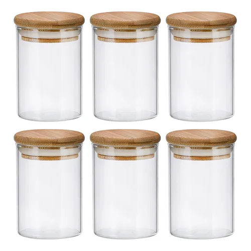 Kit 6 Potes Vidro Hermetico C/ Tampa Bambu Redondo 200ml Cor Transparente