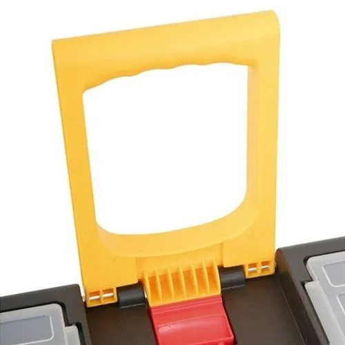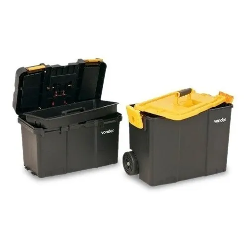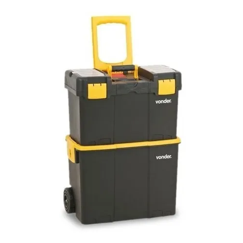 Possui tampa com estrutura reforçada com 2 compartimentos, bandeja para ferramentas removível, alça dobrável, rodas para transporte e travas reforçadas.