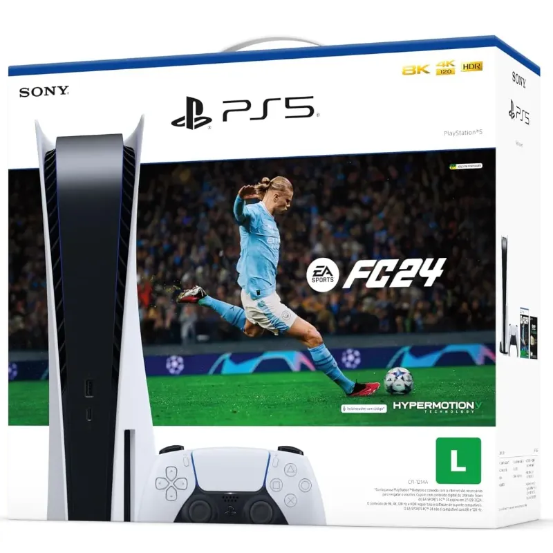 O console PS5™ oferece novas possibilidades de jogabilidade que você nunca imaginou. Reproduza jogos para PS5 e PS4 em Blu-ray Disc. Além disso, você também pode baixar jogos digitais para PS5 e PS4 pela PlayStation Store. Experimente o carregamento extremamente rápido do SSD de ultra-velocidade, uma imersão mais profunda com suporte à resposta tátil, gatilhos adaptáveis e áudio 3D. Além de uma geração totalmente nova de jogos incríveis PlayStation®. Na velocidade da luz: Domine o poder das CPU e GPU personalizadas e do SSD com E/S integradas que redefinem as regras do que o console PlayStation pode fazer. Jogos deslumbrantes: Maravilhe-se com os gráficos incríveis e experimente os recursos do novo PS5. Imersão de tirar o fôlego: Descubra uma experiência de jogos ainda mais profunda com a ajuda da resposta tátil, dos gatilhos adaptáveis e da tecnologia de áudio 3D. O EA SPORTS FC™ 24 traz para você o Jogo de Todo Mundo, a experiência mais autêntica de futebol de todos os tempos com o HyperMotionV*, PlayStyles otimizada pela Opta e um Frostbite™ Engine aprimorado, que reinventa como mais de 19.000 atletas realistas se movimentam, jogam e aparecem em todas as partidas. Movimentos do futebol. Jogadas do futebol. Jeito do futebol. A SPORTS FC™ 24 leva você para mais perto do futebol do que nunca, impulsionado por três tecnologias que entregam realismo em todas as partidas. VIVENCIE A TECNOLOGIA HYPERMOTIONV A tecnologia HyperMotionV reproduz o futebol como ele é jogado, levando todas as movimentações das partidas para o jogo. Uma nova era do Ultimate Team™ Será uma temporada de primeiras vezes: você poderá melhorar atletas do seu clube com as Evoluções do Ultimate Team, incluir as jogadoras do futebol feminino no seu time dos sonhos e dar outras dimensões para a sua jogabilidade com a tecnologia PlayStyles. Clubes maiores e Carreiras melhores Junte-se a suas amizades, ou jogue contra elas, via crossplay** nos Clubes e controle o seu destino no futebol com novos recursos nas Carreiras de Manager e de Jogador. Autenticidade inigualável no Jogo de Todo Mundo. O EA SPORTS FC™ 24 é a casa de mais de 19.000 atletas sob licença, 700 times, 100 estádios e 30 ligas do mundo do futebol.