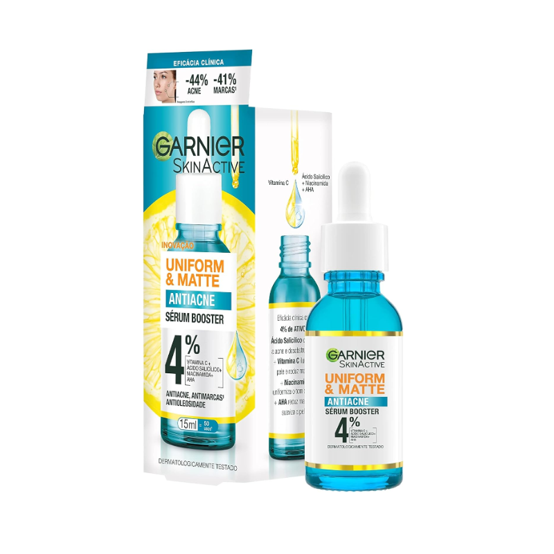 Cansada de lutar contra espinhas e as marcas que elas deixam para trás? A busca por uma pele uniforme e livre de acne pode ser frustrante, mas a solução está ao seu alcance. Apresentamos o Sérum Facial Garnier Uniform & Matte Antiacne, um tratamento diário revolucionário que oferece uma dupla eficácia clínica comprovada para transformar a saúde da sua pele. Este sérum inovador é formulado com uma poderosa concentração de 4% de ativos dermatológicos, incluindo Vitamina C, Ácido Salicílico, Niacinamida e AHA. Essa combinação sinérgica não apenas combate a acne existente, mas também atua diretamente na redução de marcas, uniformizando o tom da pele. Sua textura leve e não oleosa é absorvida rapidamente, proporcionando um efeito matte instantâneo que controla o brilho e a oleosidade ao longo do dia, sem obstruir os poros. Os resultados são visíveis e progressivos: após apenas 3 semanas, estudos clínicos mostram uma redução de 44% na acne e, após 6 semanas, uma diminuição de 41% na visibilidade das marcas. Incorpore o Sérum Facial Garnier Uniform & Matte Antiacne em sua rotina e descubra o poder de um tratamento completo que cuida da sua pele em todas as frentes.