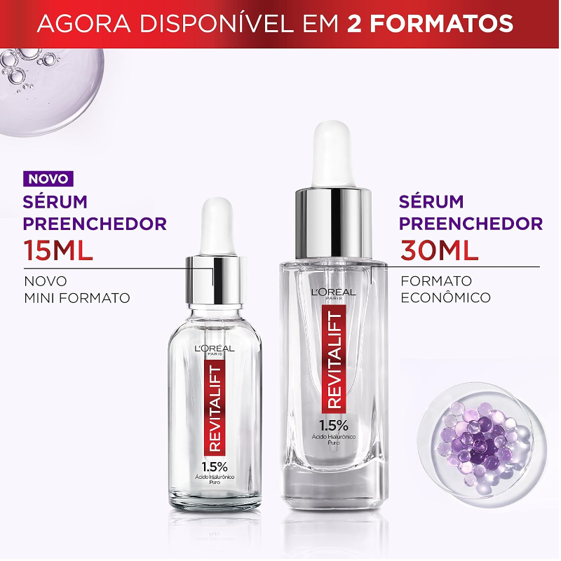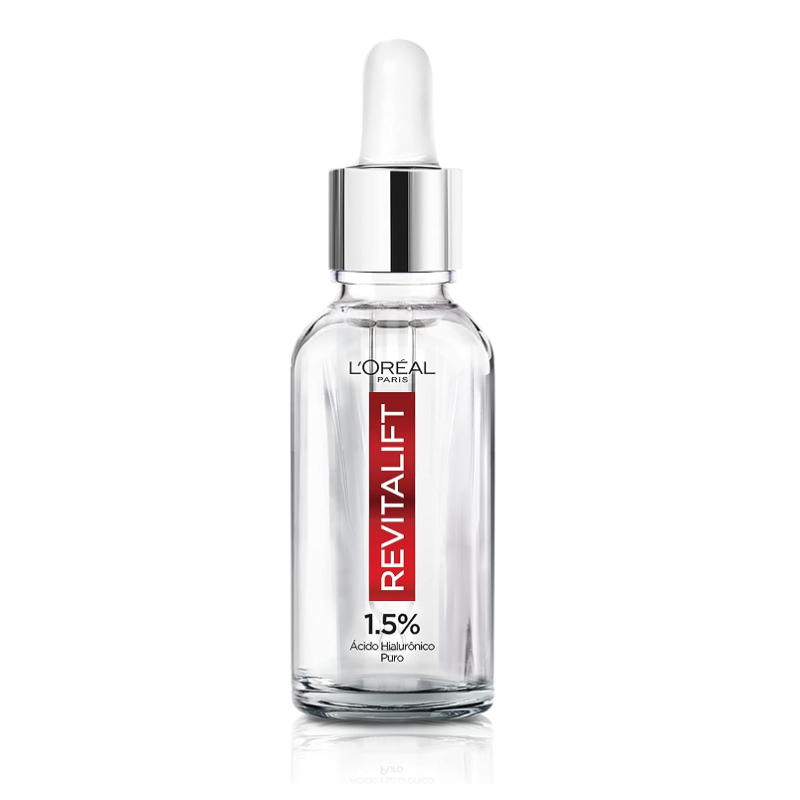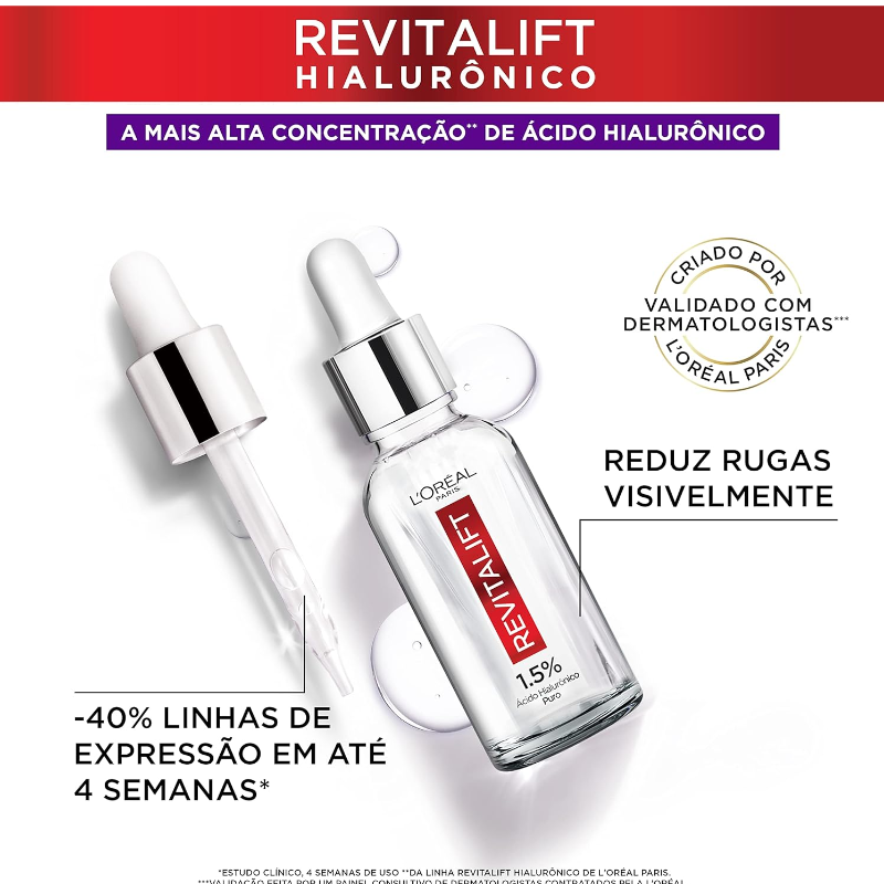 Benefícios O Sérum Preenchedor Anti-Idade Revitalift Hialurônico da L'Oréal Paris oferece uma ação preenchedora e uma hidratação profunda e duradoura graças ao 1,5% de ácido hialurônico. Em uma semana*: a pele parece mais radiante, profundamente hidratada, com sensação de preenchida e firme. Em duas semanas**: redução das linhas de expressão (-19%) e redução de rugas (-14%). Em 4 semanas**: redução das linhas de expressão (-40%) e redução de rugas (-31%). Com rápida absorção e sem sensação oleosa, é adequado para todos os tipos de pele, incluindo as sensíveis.