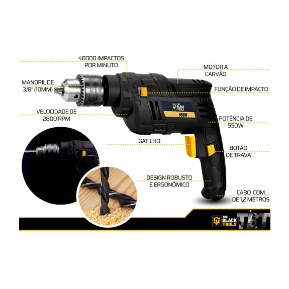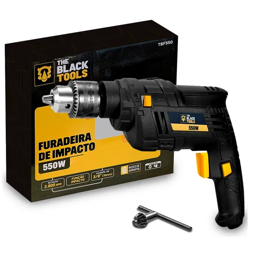 A furadeira com impacto TBF550 da The Black Tools é uma ferramenta elétrica poderosa projetada para tornar perfurações eficientes e precisas em diversas superfícies.