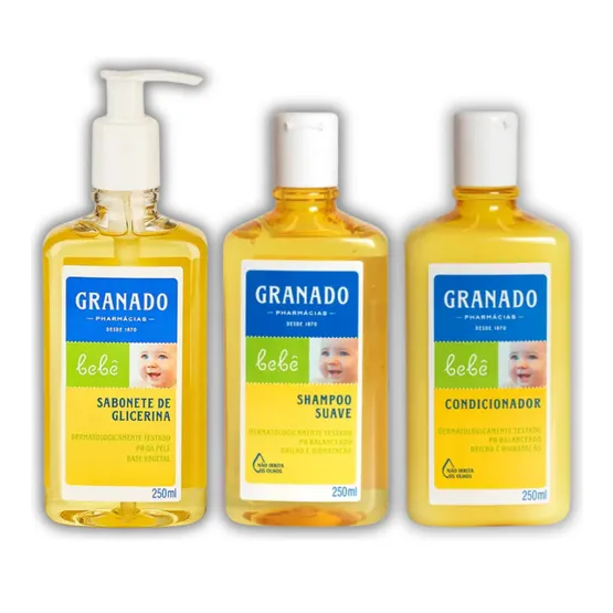 Cuidado completo e delicado para a pele e os cabelos do seu bebê. O kit Granado Bebê conta com três itens essenciais para a higiene diária: shampoo, condicionador e sabonete líquido. Todos com fórmulas suaves, hipoalergênicas, sem corantes e dermatologicamente testadas, ideais para a pele sensível dos pequenos desde os primeiros dias de vida.