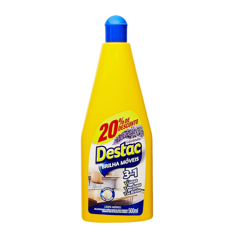 Destac Brilha Móveis limpa, perfuma, dá brilho e protege seus móveis já no primeiro uso. Mais que um lustra-móveis, ele é ideal para a limpeza de madeira tratada, vidros, boxe de banheiro, revestimento de porcelanato, azulejos, armários planejados, superfícies de mármore e granito, vidros, espelhos, plásticos, esmaltados e eletrodomésticos. Destac Brilha Móveis possui exclusiva fórmula com silicone que forma uma camada protetora, garantindo limpeza, brilho e maior durabilidade para os seus móveis de madeira, estofados de couro e couro sintético. Prático e fácil de usar, é só agitar o frasco, aplicar o produto em um pano seco e limpo, e passarde man eira uniforme, sem excesso, sobre a superfície desejada, em seguida, passe uma flanela ou pano seco para lustrar e realçar o brilho natural. Com Destac Brilha Móveis sua casa vai ficar perfeitamente limpa e com um suave perfume de lavanda por muito tempo. Destac, limpa toda a casa Destac Brilha Móveis te ajuda a limpar a casa inteira. Ele forma uma película de proteção em vidros, espelhos e revestimentos de parede, evitando o acúmulo de sujeira e a formação de manchas. Com ele todos os ambientes vão ficar sempre limpos, com brilho e um delicioso aroma floral, e você vai ter tempo de sobra para assistir ao seu programa favorito. A família toda vai curtir o astral de sua casa bem cuidada e sempre pronta para receber pessoas queridas. Tenha sempre Destac Brilha Móveis por perto! Qualidade e cuidado No Brasil desde 1983, Destac é um limpador com fórmula especializada que proporciona perfume, limpeza e destaca o brilho natural dos mais variados tipos de piso e dos móveis. Destac é uma marca que se preocupa com o meio ambiente buscando utilizar embalagens recicláveis. Para a limpeza completa de sua casa experimente também: Destac Porcelanato, Destac Laminados, Destac Multipisos e Destac Madeiras.