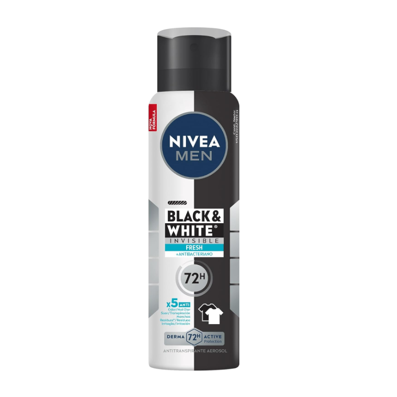 NIVEA MEN Desodorante Masculino Antitranspirante Aerossol Black & White INVISIBLE Fresh 150 ml é um desodorante masculino aerossol que promove máxima proteção de NIVEA contra o suor, mau odor, manchas, resíduos nas roupas e irritação, além de proteger a pele. Deixa as axilas suaves e macias, é fácil de aplicar, e possui proteção dermatologicamente testada. Para que serve? NIVEA MEN Desodorante Aerossol Black & White INVISIBLE Fresh proporciona a melhor proteção contra manchas e suor. Sua fórmula é 5x anti odor, suor, manchas, resíduos nas roupas e irritação na pele, com proteção prolongada de 72 horas e antibacteriano. Evita manchas brancas em roupas pretas e manchas amarelas em roupas brancas. Benefícios e diferenciais: Anti-manchas com proteção de 72 horas A melhor proteção contra manchas e suor Fácil de aplicar Dermatologicamente testado Cuidado suave Antibacteriano