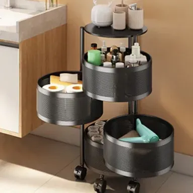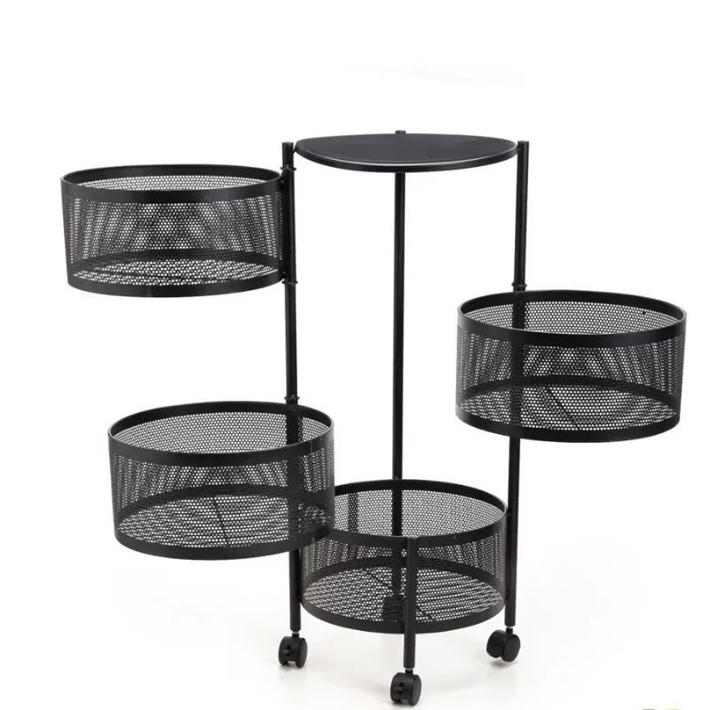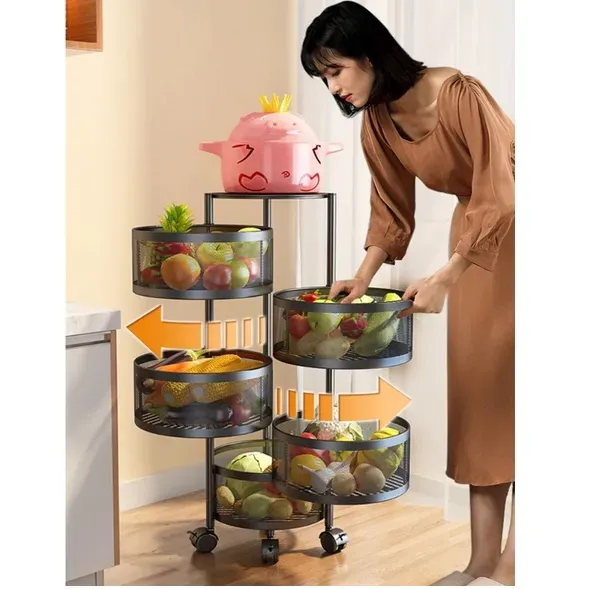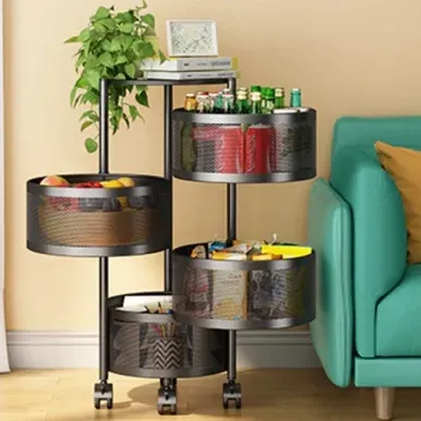 ## Organizadora Multiuso de 4 Andares Com rodinhas e Cesto moveis ## Novidade no Brasil, produto exclusivo feito em Aço Carbono super resistente, suporta galão de 20 litros na parte superior. - Já vai montada, 4 cestos de armazenamento vazados, melhor circulação de ar nos alimentos, dificulta entrada de insetos, designer elegante. Conta com rodinhas para melhor acomodação em qualquer ambiente e facilitar a locomoção para outro ambiente, como escritórios, salas etc.. Material: Aço Carbono Medidas: Altura: 76 CM Diâmetro: 32 CM