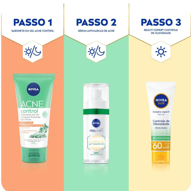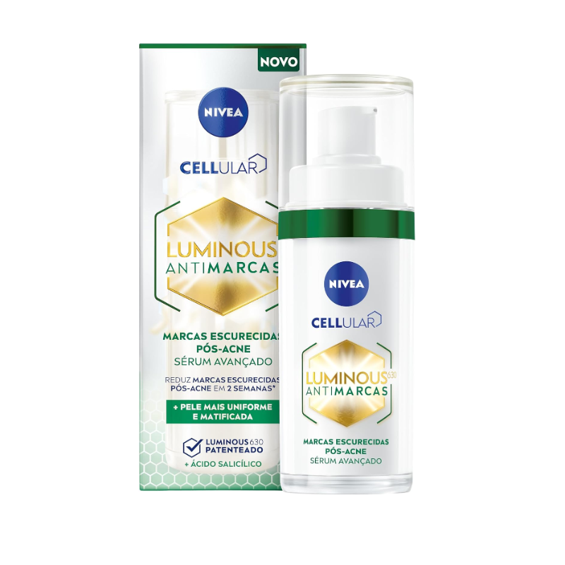O que é? NIVEA Sérum Facial Cellular Luminous 630® ANTIMARCAS Acne é um sérum avançado que reduz marcas escurecidas de acne em 2 semanas*. Para que serve? Sua fórmula foi desenvolvida especialmente para a pele mista, oleosa e propensa à acne, por isso, além de matificar a pele, também controla a oleosidade. O ácido salicílico, presente na formulação de NIVEA Luminous 630® Acne, tem propriedades esfoliantes, que uniformizam e melhoram a textura da pele, deixando-a macia. Outro ingrediente presente é o ácido hialurônico que ajuda na prevenção das rugas. Este sérum conta também com Luminous 630®, um ingrediente que atua em nível celular e que é resultado de pesquisas minuciosas realizadas durante 10 anos. Seu efeito antimarcas é comprovado em todos os tons de pele, deixando-as iluminadas. *Teste de percepção. Benefícios e diferenciais: - O FPS 60 garante muito alta proteção solar - Efeito matte instantâneo e duradouro - Proteção por dentro* e por fora - Não obstrui os poros¹ - Dermatologicamente e oftalmologicamente testado - Fórmula com cor média - Previne o envelhecimento da pele - Textura leve - Controla a oleosidade - Poderoso efeito antioxidante natural