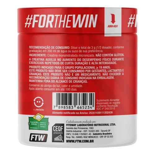 Creatina FTW é suplemento alimentar em pó à base de creatina monohidratada micronizada. Pode ser utilizado por pessoas adultas como parte de uma rotina alimentar equilibrada e associada à prática de atividade física.