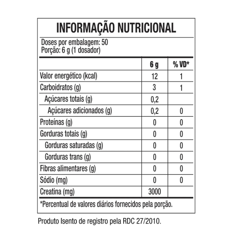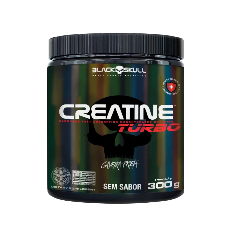 A Creatine Turbo da Black Skull US é um suplemento que contém 50% de Creatina e 50% de Maltodextrina (Carboidratos) em sua composição.