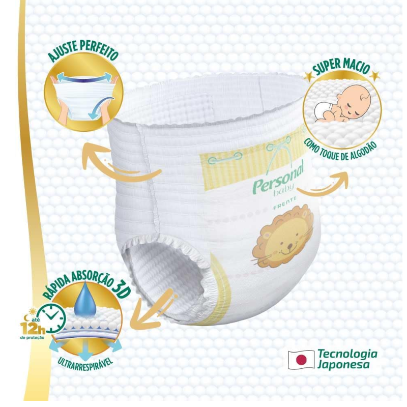 Produto descartável com excelente e rápida absorção 3D, composto por camada de gel superabsorvente e fibras de celulose, cobertura supermacia e camada externa respirável. Cintura com ajuste perfeito que não aperta a barriguinha. Fácil de vestir e fácil de tirar. Tecnologia Japonesa. Componentes atóxicos, não propensos a causar irritação em contato com a pele. Dermatologicamente testado.