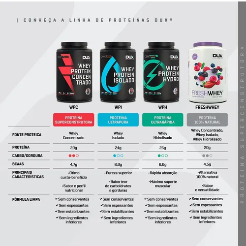 Whey Protein Concentrado DUX® é uma proteína 100% pura, extraída exclusivamente do soro de leite, sem adição de proteínas inferiores. Possui um perfil nutricional completo e um sabor real, ideal para ser consumido pré/pós treinos, como um snack prático, ou em suas receitas.