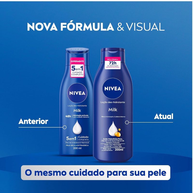 O que é? NIVEA Loção Deo-Hidratante Milk é um hidratante corporal que garante cuidado intenso e eficaz, oferecendo 72 horas de hidratação contínua para deixar a pele muito mais macia, suave e visivelmente saudável a cada aplicação. Para que serve? Enriquecida com ácido hialurônico puro, óleo de amêndoas e sérum de nutrição profunda, a loção deo-hidratante proporciona uma hidratação profunda e duradoura para peles secas a extrassecas, ajudando a restaurar a barreira natural da pele e mantendo a aparência saudável, bem cuidada e protegida. Benefícios e diferenciais: - Hidratação profunda por 72 horas - Cuidado intenso diário - Nutrição profunda eficaz - Não oleoso e de rápida absorção - Dermatologicamente testado e aprovado