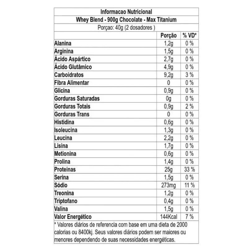Whey blend (900g) - max titanium whey blend é um produto que foi elaborado com 4 fontes de proteínas, fornecendo 25g de proteína por porção. A proteína.é um dos suplementos alimentares mais populares dentre os praticantes de atividade físicas. Dentre outras funções, ela auxilia na recuperação tecidual.conheça seus componentes: albumina (proteína do ovo): rica em aminoácidos, a clara do ovo possui um ótimo aminograma (alto valor biológico, ou seja, possui a maioria dos aminoácidos essenciais) e boa digestibilidade.proteína da soja: a principal vantagem da proteína de soja.é a de que ela não. é de origem animal como as proteínas do soro do leite (whey protein). Contém 8g de arginina por 100g de proteínas. Proteína concentrada do soro do leite: produto obtido pela remoção de constituintes não-proteicos do soro de tal modo que o produto final seco contenha, pelo menos, 25% de proteína. Em geral, o teor proteico dos concentrados varia entre 25 e 89%. Proteína hidrolisada do trigo: a proteína de trigo possui uma alta solubilidade e digestibilidade, quando comparada com outras proteínas. é uma ótima fonte de glutamina, pois o seu nível é quase duas vezes o nível de outras fontes de proteínas. Possui uma lista de aminoácidos bem completa, com.exceção da lisina, que deve ser adquirida através de outra fonte proteica benefícios: alta quantidade de bcaa's. Alto valor biológico. Coadjuvante na formação de massa muscular. Recuperação muscular pós-treino.