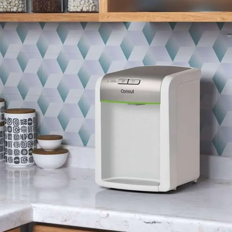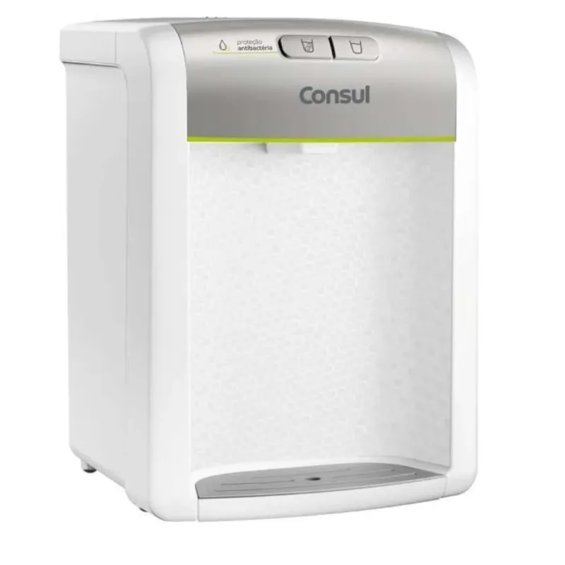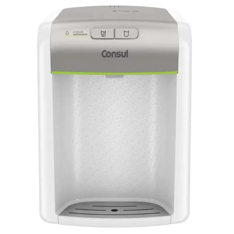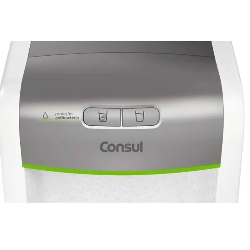 Purificador de água Consul Prata refrigerado, com proteção antibactérias. Água refrigerada e livre de bactérias Com refil troca fácil e sistema de proteção antibactérias, o Purificador Consul possui 2 níveis de temperaturas, natural ou gelada, e elimina as bactérias da sua água! Filtragem classe A Com refil de máxima tecnologia e filtragem classe A, o Purificador de Água Consul garante máxima redução de cloro livre, retenção de partículas Classe A e eficiência bacteriológica! Água pura sempre Com o Purificador de Água Consul você tem água natural purificada até mesmo sem energia elétrica! Proteção antibactérias Através de um filtro com eficiência bacteriológica, a Consul traz mais saúde para sua família! Refil troca fácil Sem complicações e sem precisar da ajuda de um técnico, basta girar e trocar o refil. Simples e fácil!