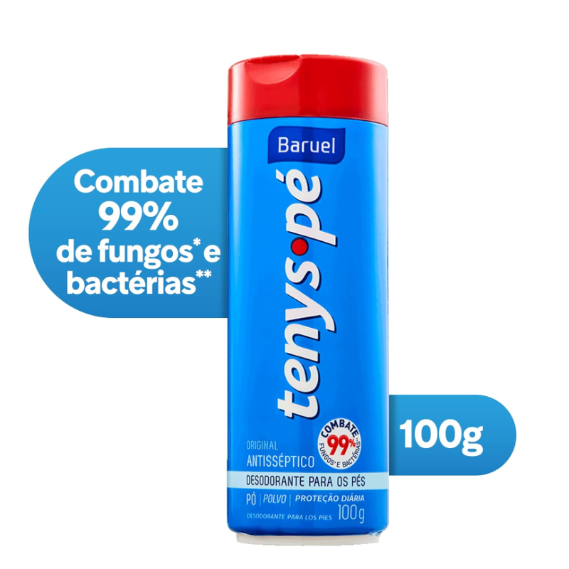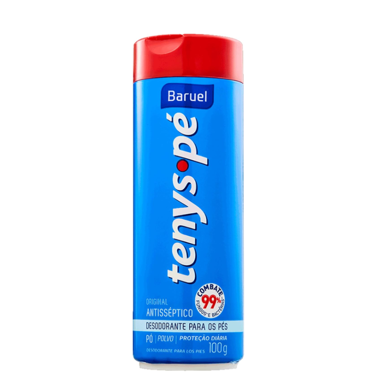 Desodorante em pó para os pés Tenys Pé Baruel Original oferece ação antisséptica e combate 99% dos fungos* e bactérias**. Ajuda a evitar frieiras e micoses nos pés. Mantém os pés sempre secos, cheirosos e protegidos com ação desodorante, além de ajudar na conservação do calçado. Dermatologicamente testado. É fácil de aplicar. O desodorante Tenys Pé Baruel Original elimina o mau odor e é ideal para antes e depois de atividades esportivas. Fungos* Trichophyton interdigitale, Trichophyton rubrum. Bactérias** Staphylococcus aureus, Corynebacterium xerosis Dicas de Uso: Aplique diariamente o desodorante para os pés em pó Tenys Pé Baruel nos pés e no interior dos calçados, evitando contato com a parte externa. Para proteção auxiliar, aplique novamente o produto após o uso do calçado. Usar antes e depois de atividades esportivas. Recomendações: Uso externo. Não ingerir. Manter fora do alcance de crianças. Deve ser aplicado por adulto ou sob sua supervisão. Não usar se a pele estiver irritada ou lesionada. Evitar contato com os olhos, caso isto ocorra, enxágue abundantemente com água. Usar somente nas áreas indicadas. Evite a inalação direta deste produto. Em caso de irritação, suspender o uso e procurar um médico. Conservar em local seco e fresco.