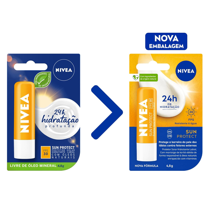 O que é? Protetor solar labial com FPS 30. Mantem os lábios hidratados e protegidos do sol por 24h. É mais proteção para seu sorriso! Para que serve o Protetor Solar Labial Nivea Sun Protect? Sua fórmula enriquecida com óleos naturais, manteiga de Karité e Vitamina E, garante lábios protegidos e saudáveis. Benefícios e diferenciais - Lábios protegidos do sol e do ressecamento - Com óleos de abacate e de jojoba - Resistente à água - Embalagem reciclável - Livre de óleo mineral Como usar o Protetor Solar Labial Nivea Sun Protect? Antes da exposição ao sol, aplicar nos lábios. Reaplique o produto sempre que necessário para garantir a proteção. Uma unidade de embalagem contém 4,8g
