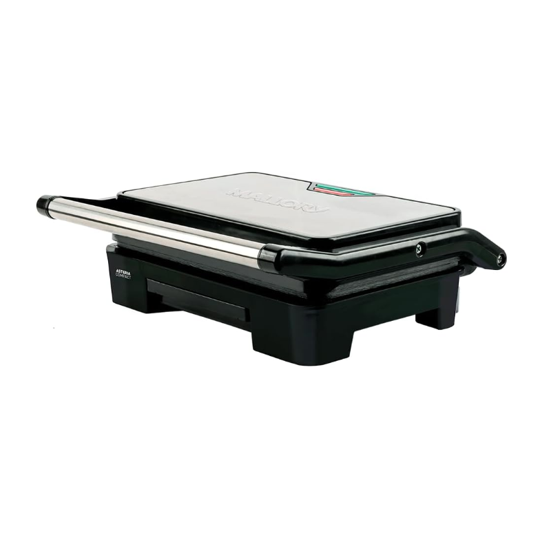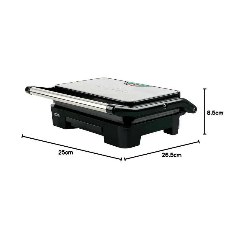 O Grill Elétrico ASTERIA COMPACT da Mallory é multifunções com placas ajustáveis. Versátil, grelha hambúrgueres e filés. Tem acabamento em aço inoxidável, placas com grande superfície antiaderente, luzes indicadoras de funcionamento, coletor de gordura integrado e alça com toque frio.