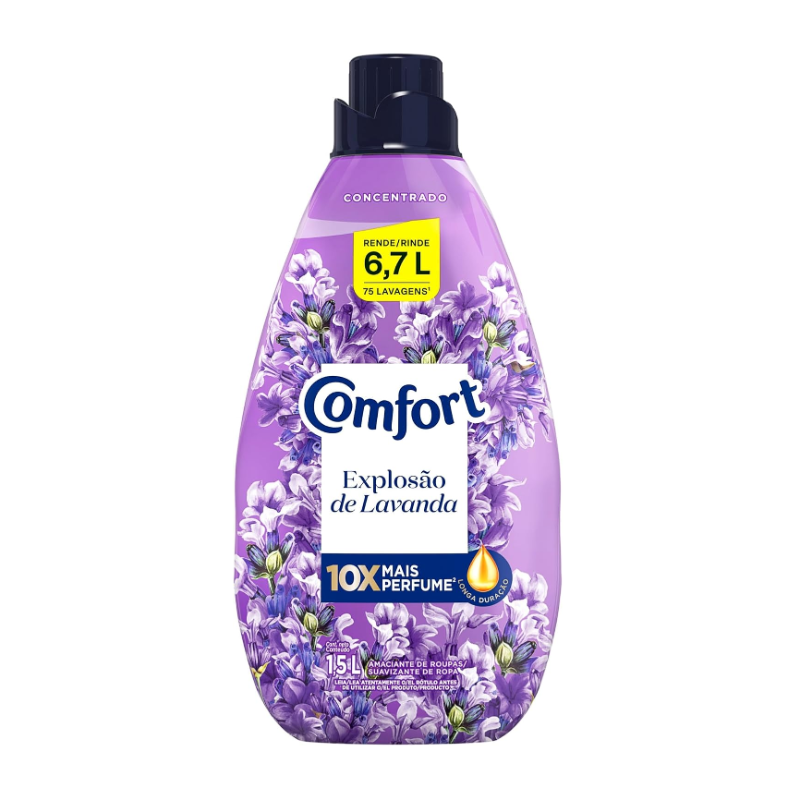 O Amaciante Concentrado Comfort Lavanda tem 10x mais perfume**, para deixar suas roupas perfumadas por muito mais tempo! Além disso, possui óleo de lavanda****, o que torna o amaciante uma explosão de lavanda ainda mais intensa. Este amaciante mantém as cores*** dos tecidos vibrantes durante mais tempo, e as suas roupas maravilhosamente perfumadas. Comfort protege o tecido contra odores e deixa uma fragrância de longa duração na sua roupa! Menos de meia tampinha do Comfort Concentrado Lavanda é suficiente para lavar a sua roupa. Sua fórmula, além de perfumar as roupas, é capaz de alinhar e proteger o tecido***, reduzindo o atrito entre as fibras durante o processo de lavagem. Comfort Concentrado tem fragrância encapsulada que penetra no tecido durante o processo de lavagem, deixando a sua roupa com um perfume intenso e duradouro mesmo depois de seca! A razão? Quando se movem, estas cápsulas de perfume rompem e liberam esta incrível fragrância, fazendo com que o cheiro dure muito mais tempo! Comfort Concentrado de 1,5 L rende 6,7 L, o equivalente a 75 lavagens* de roupas cuidadas e muito perfumadas! Sua garrafa e tampa são feitas de plástico 100% reciclado e reciclável, daí a sua cor cinza. Comfort é um aliado perfeito na hora de cuidar das suas roupas, pois protege os tecidos e deixa-as incrivelmente perfumadas. *Considerando recomendação de dosagem para máquinas até 8 kg (20 ml). **Teste analítico com 22,5 ml de produto comparado com marca diluída, sem perfume encapsulado, do mesmo fabricante. ***Benefícios de tratamento do amaciante obtidos versus roupa lavada sem amaciante. ****Contém óleo de lavanda na composição da fragrância.