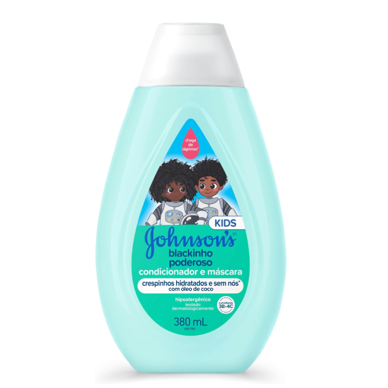 Com óleo de coco em sua fórmula, o Condicionador e Máscara JOHNSON's Blackinho Poderoso foi cocriado com consumidores para desembaraçar e deixar os cachinhos macios e hidratados. Desenvolvido especialmente para o cabelo das crianças com curvaturas de 3B a 4C a sua fórmula é Liberadinho de TudoTM: livre de parabenos, sulfatos, corantes, silicones e petrolatos e possui dupla ação: para condicionador, use por 1 minuto e para efeito de máscara, use por 4 minutos.