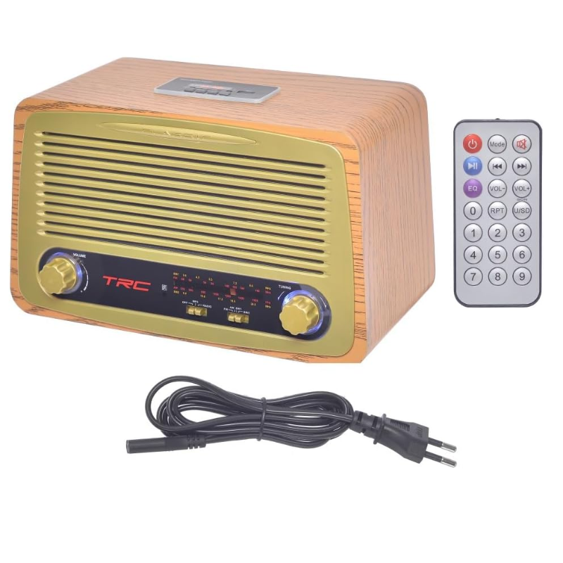 TRC 212 Caixa de Som Portátil Retro Bluetooth 35W Rms, USB, leitor de cartão, Rádio FM, controle remoto e bateria recarregável.